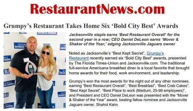 The story titled “Grumpy’s Restaurant Takes Home Six ‘Bold City Best’ Awards” was featured on RestaurantNews.com.
